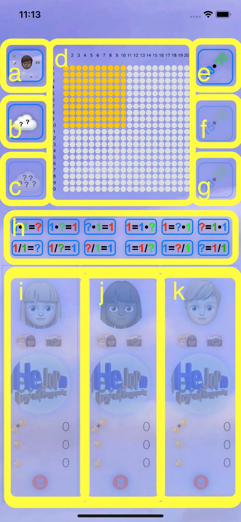 - i bis j sind die auszahlbaren "Spieler". Es kann ausgewählt werden, welcher Spieler aktiv ist. Für diesen Spieler werden dann die Ergebnisse der gelösten Aufgaben gespeichert. Sie können mit Drücken der Papierkorbtaste wieder auf 0 gesetzt werden. Das Symbolbild (Avatar) kann geändert werden und auch ein persönliches Bild, damit man sich merken kann, wem diese Einstellung gehört. Das Bild wird aus dem Photo-Ordner vom Spieler ausgewählt und sollte ihn repräsentieren.