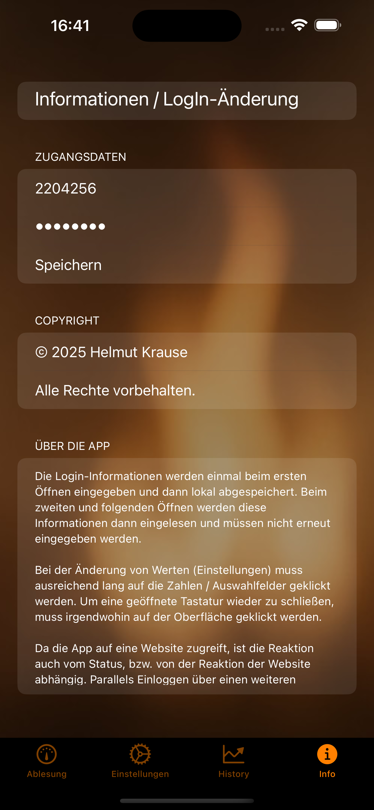 Hier können die Zugangsdaten erneut eingegeben werden, etwa wenn zu Beginn eine Falscheingabe erfolgte. Im Feld "Über die App" sind Bedienungsinformationen zu finden. |